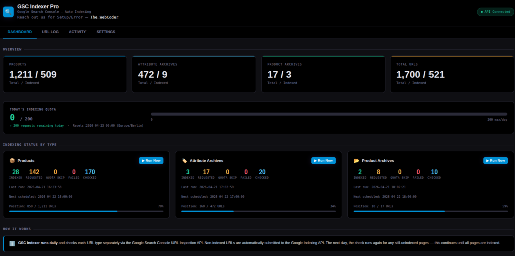 Per-Type Progress Bars: Each of the three URL types (products, attributes, archives) has its own progress bar showing how far through the full list today’s run got. You can see at a glance: “Products: position 340 out of 789.”